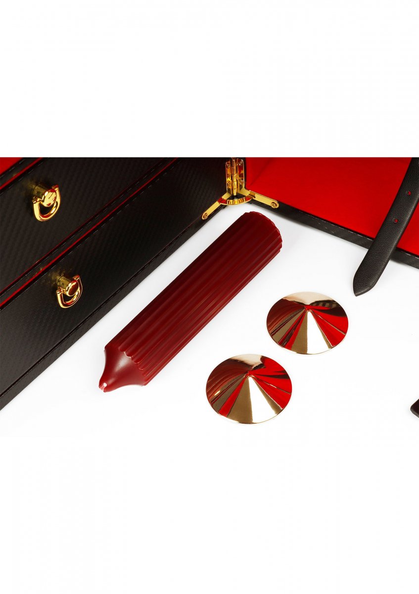 I den iögonfallande väskan väntar en värld av möjligheter. Här hittar du allt från ett stilrent halsband med koppel till matchande handbojor och handledsbojor, en mjuk ögonbindel, en lekfull gag ball, en slät paddel och sensuella detaljer som nipple covers och ett stämningshöjande ljus. Varje del är noggrant utvald för att komplettera varandra och skapa en helhetsupplevelse där fantasin får ta plats.