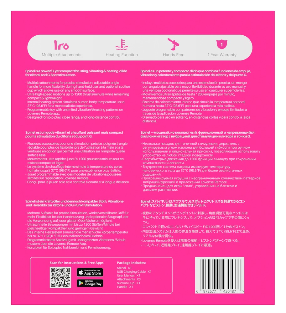 Spinel kombinerar stötrörelse, vibrationer och värme i en och samma enhet. Den här trion skapar en dynamisk upplevelse där känslan kan skifta från mjuk och sensuell till kraftfull och pulserande. Resultatet blir en sexleksak som kan anpassas efter humör, tempo och fantasi.