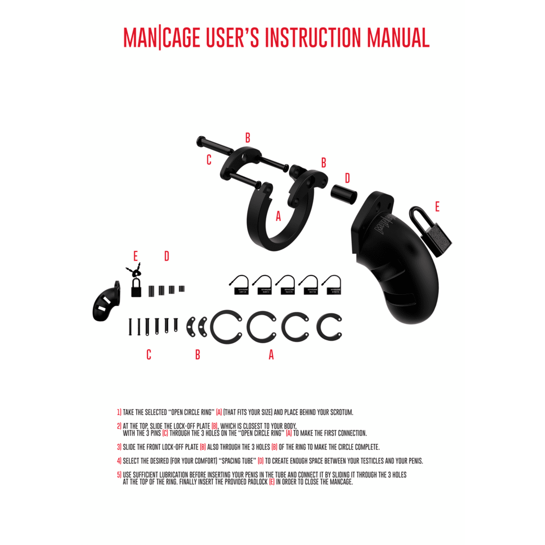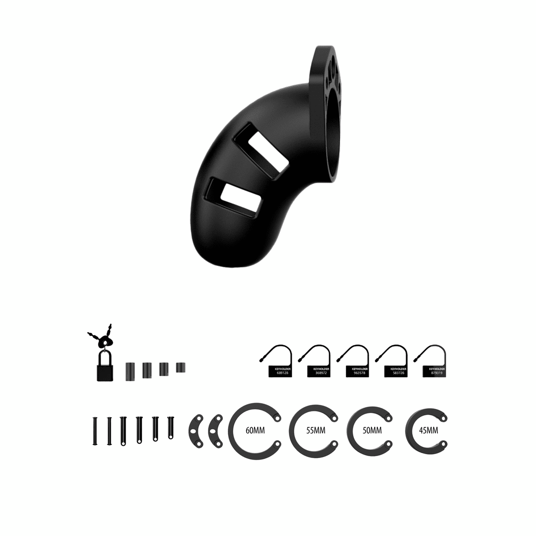 Mancage levereras med fem olika ringar och distanser för att du ska kunna anpassa storleken exakt efter dina behov. Oavsett storlek och form kan du skapa en passform som är både säker och bekväm. De medföljande plastlåsen är idealiska för diskretion vid säkerhetskontroller, medan det robusta metalllåset ger en autentisk känsla av makt och kontroll.