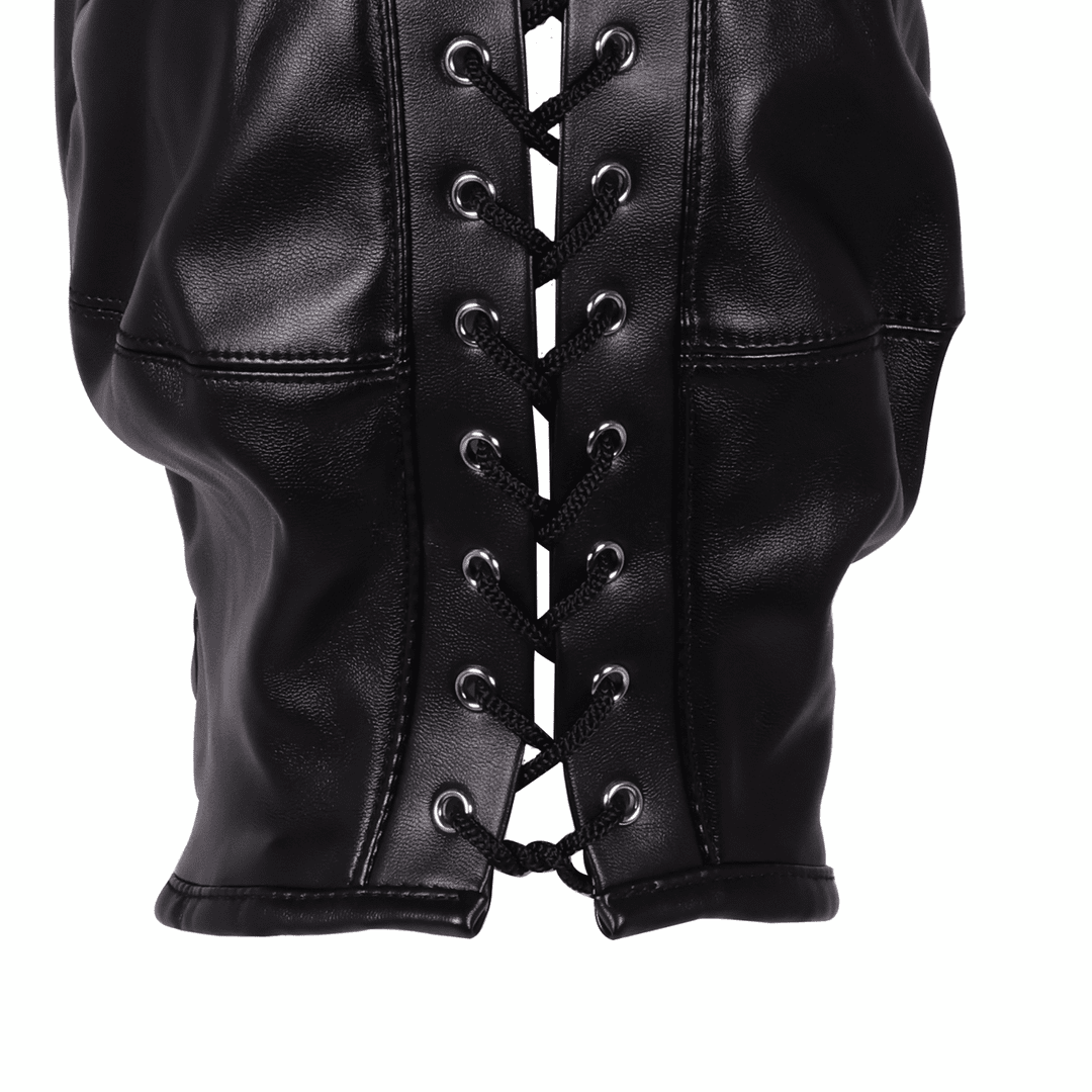 Masken är tillverkad i en kombination av slitstark polyester, stilfull PU-läder och robusta ståldetaljer. Den känns lyxig att ta på och ännu lyxigare att bära. Snörningen baktill gör att du kan anpassa passformen exakt efter ditt huvud, så att masken sitter stabilt även under de mest intensiva lekarna. Inget glider av – inget förstör stämningen.
