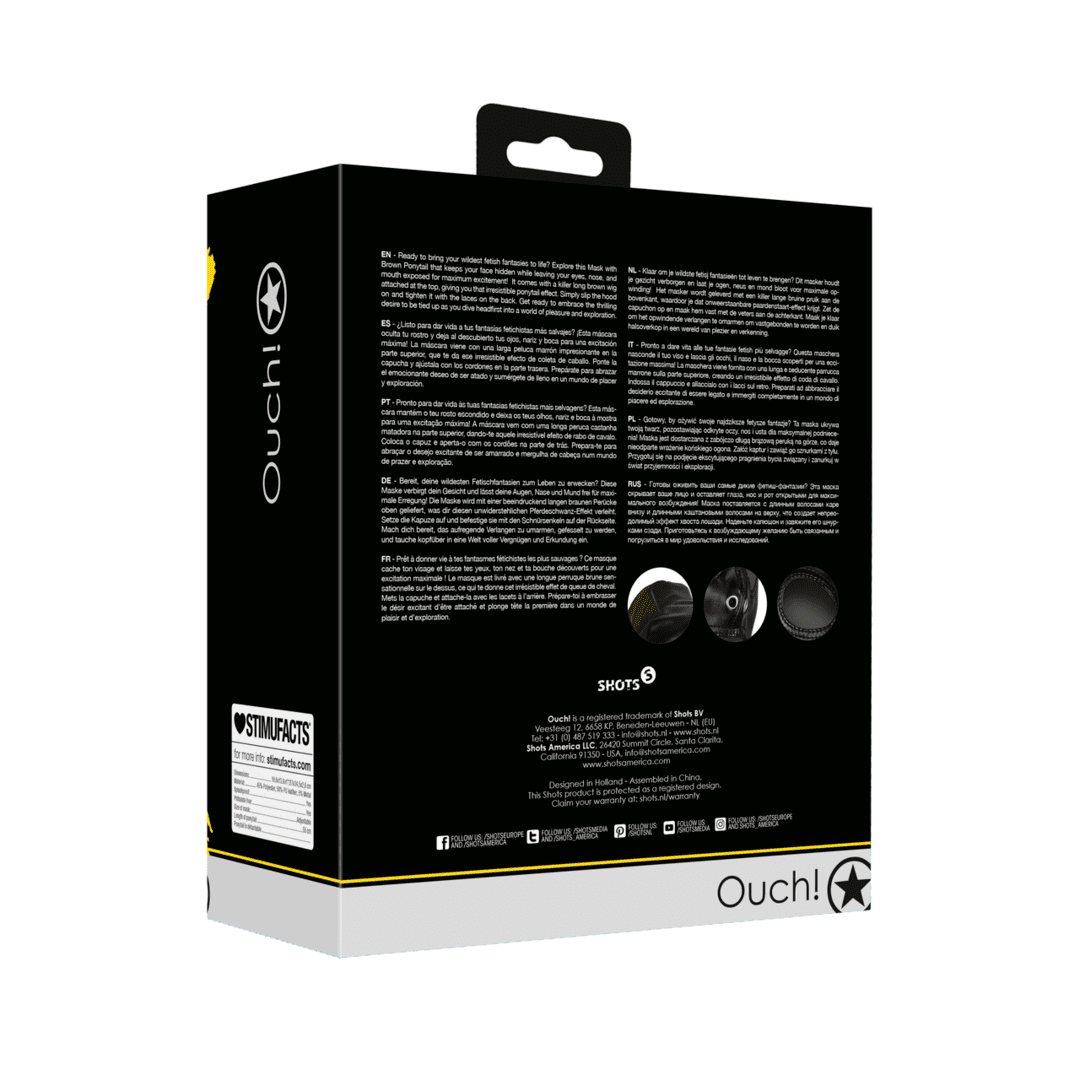 Redo att förverkliga dina mest kittlande fetishfantasier? Med Ouch! Mask med brun hästsvans kliver du rakt in i ett rollspel där du är både anonym och oemotståndlig. Denna mask är mer än bara en huva – det är en karaktär, en attityd och ett rop på äventyr. Med ögon, näsa och mun fritt exponerade, och en lång brun peruk som svänger frestande i varje rörelse, är det bara att knyta fast snörningen och ge dig hän.